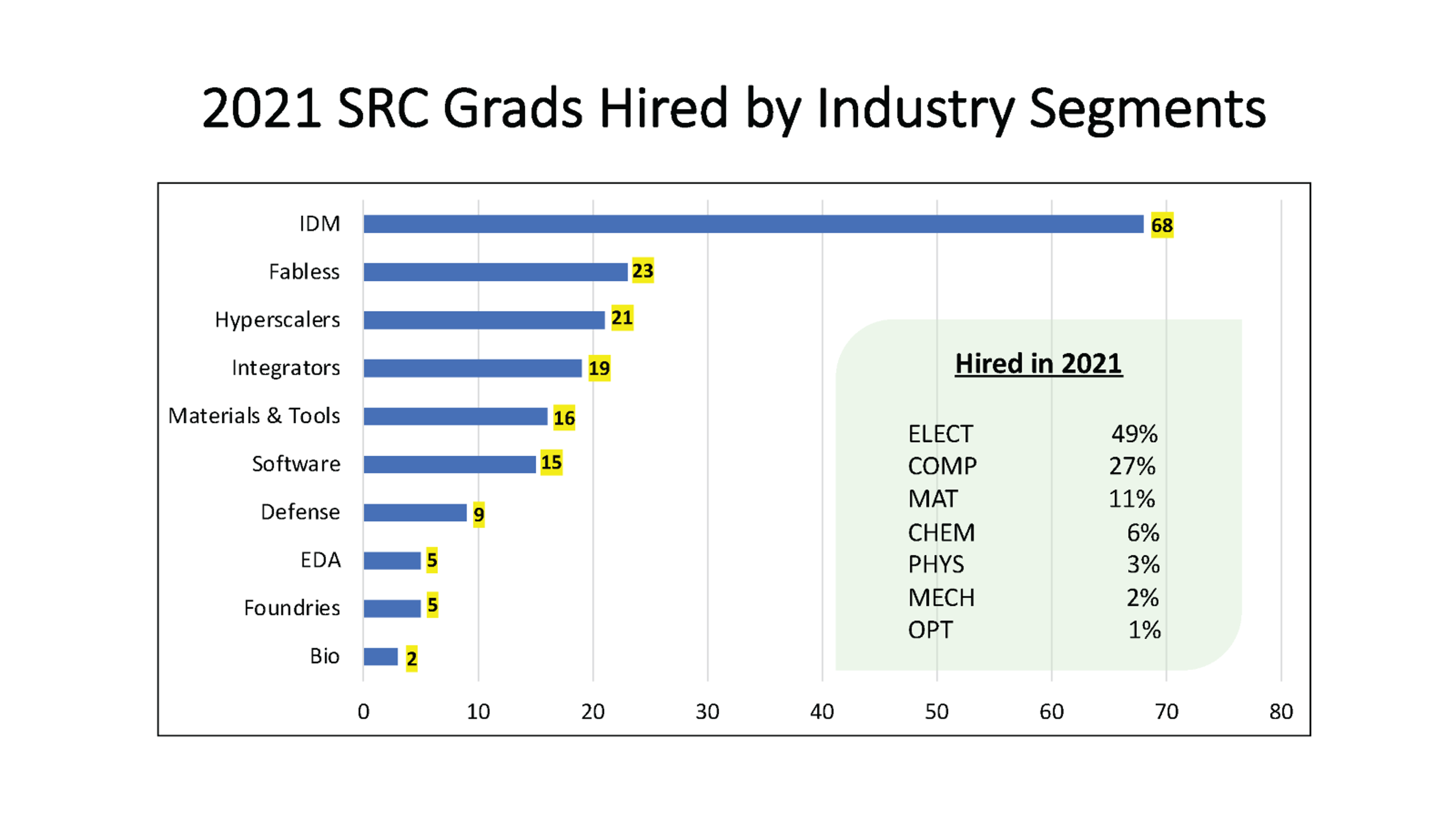 Let’s put the SRC numbers in the context of the nation-wide data collected by the American Society for Engineering Education (ASEE). The total number of EE and ECE PhDgraduates in 2021 was 2,423 (Engineering & Engineering Technology by the Numbers (2021)). How many of them are ‘semiconductor microelectronics’ graduates? A reasonable assumption is that the fraction of ‘semiconductor microelectronics’ PhD candidates across all EE and ECE specializations is related to the fraction of faculty with semiconductor research profiles. For example, at North Carolina State University ECE department, approximately 20% of faculty are involved in research related to semiconductor microelectronics, therefore representing 20% of ‘semiconductor’ PhDs (source: Dr. Victor Zhirnov). By the same scale, we can calculate that 485 were semiconductor EE/ECE PhD graduates in 2021, nationwide. As a first-order estimate, 172 of the PhD graduates from SRC’s Talent Factory represent approximately 35% of the total.