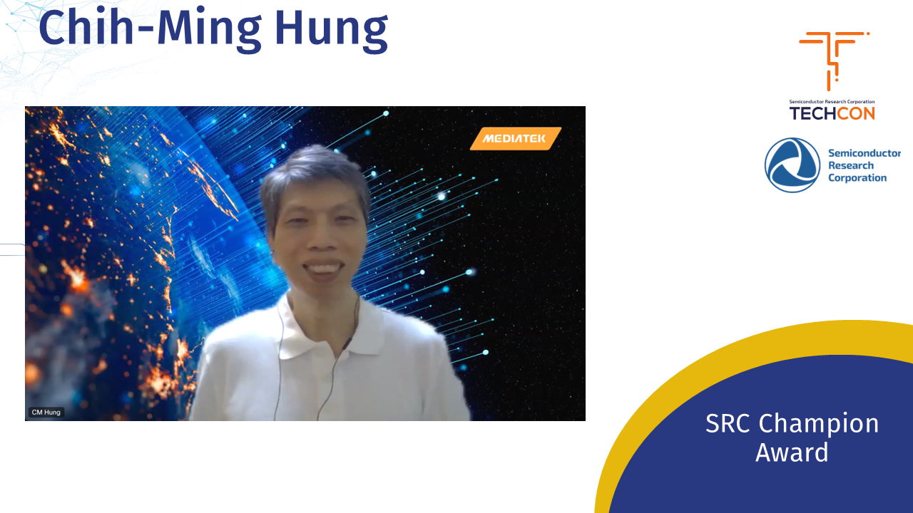 honors those who have demonstrated exemplary support of SRC and its mission. This year's Champion is Dr. Chih-Ming “C.M.” Hung of MediaTek, Inc. Chih-Ming's association with SRC goes back to his graduate school days as an SRC Research Scholar, supervised by Prof. Ken O, current Chair at UT Dallas’s Texas Analog Center of Design. After receiving his Ph.D., Dr. Hung joined TI in 2000 and maintained a 10-year engagement with SRC as a project Liaison and Advisory Board member. Recognized as an expert in his field, he has guided the analog and mixed-signal research community to adopt digital RF processor technology. Since 2011, Dr. Hung has been with MediaTek, advocating for and mentoring educators, researchers, and students globally in RF and wireless technologies for 5G and beyond. In 2021, with Dr. Hung’s enthusiastic support, MediaTek joined SRC, expanding the wireless research portfolio to include East Asian faculty and scholars. Congratulations, Chih-Ming Hung!