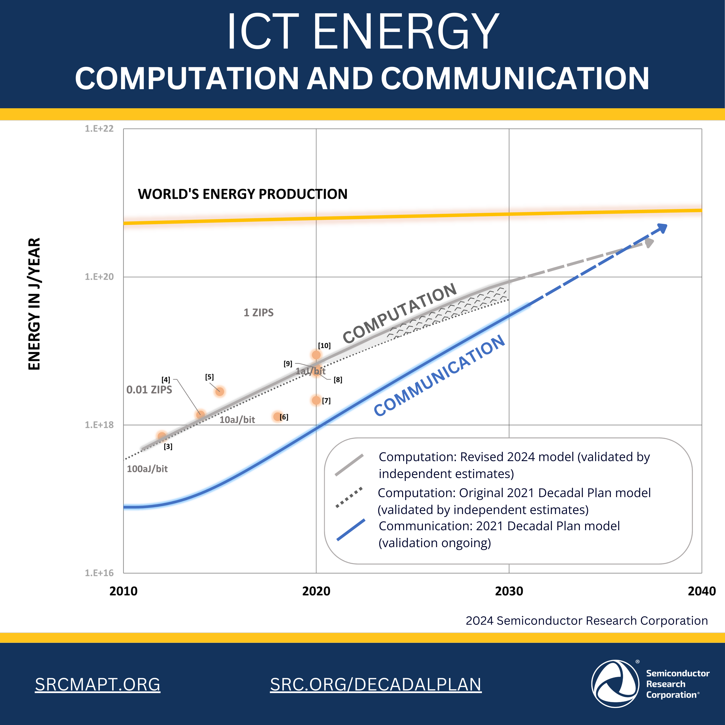 As highlighted in the 2022 report, 66% of the new projects we began funding that year aligned with SRC’s commitment to sustainability. For new projects starting in 2024, about $53M (or 53%) of the SRC research investment portfolio is dedicated to building efficient computing systems. As noted in both the Decadal Plan and MAPT roadmap, these improvements are necessary to keep pace with the growing demands of the ICT industry. In 2021, the Decadal Plan for Semiconductors developed a model for total energy consumption by computing. The main conclusion was that energy is a big and rapidly growing problem for ICT.